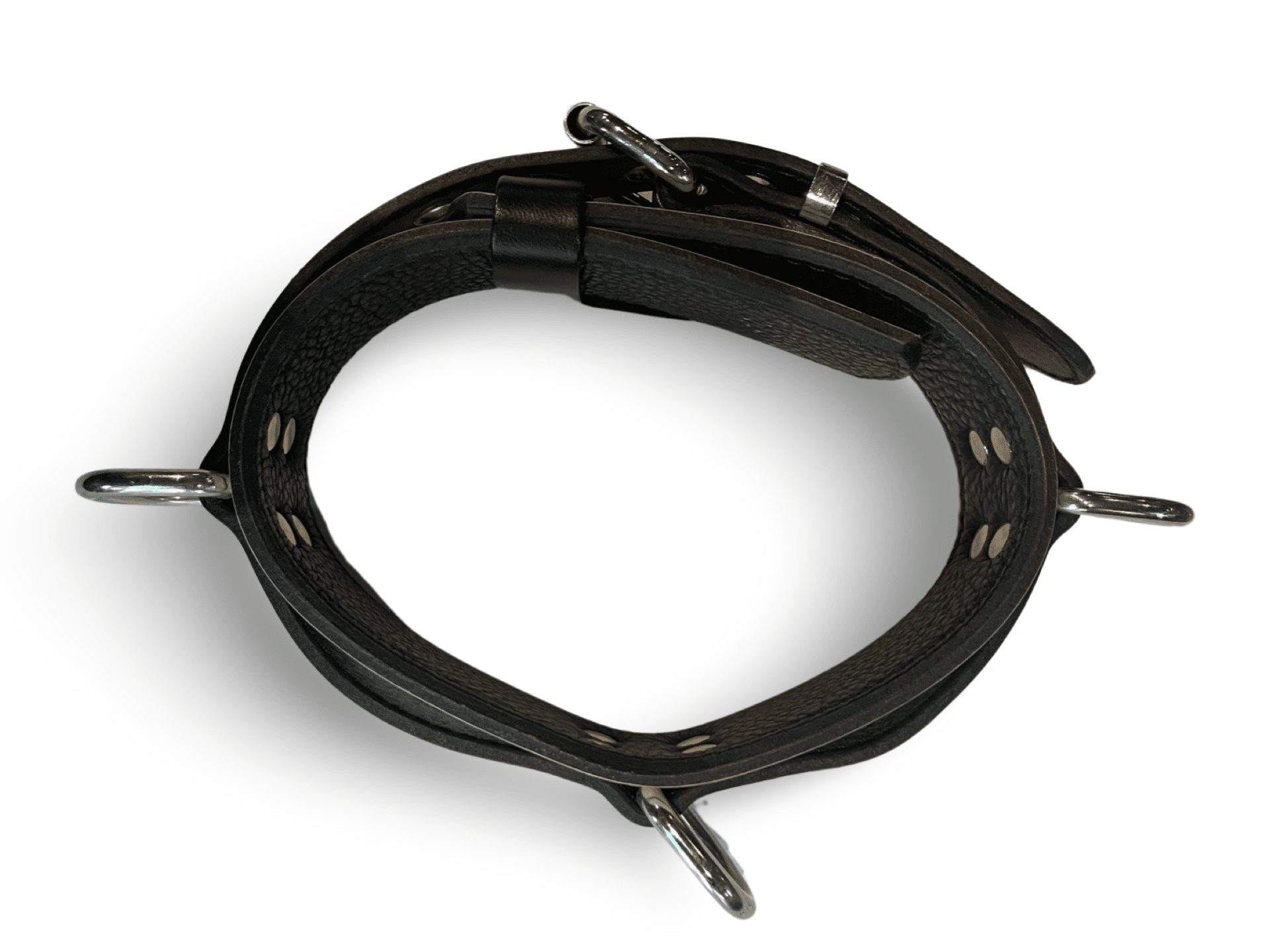 To complete the bondage set the 3 D Ring Belt Leather Bondage Collar adds a myriad of permutations to your Domination and submission play. The materials and construction are the same as the matching Wrist and Ankle Restraints. The outer layer of leather robust motor cycle weight and the inner layer of leather is made from fine lustrous garment leather. Smooth and soft against the skin. The outer adjustment strap is constructed from shoe lining leather offering the highest level of tensile strength. The rings just cry out for a dog lead. The two side rings are an ideal place to secure the scissor snaps from our matching wrist restraints rendering your partner open and available