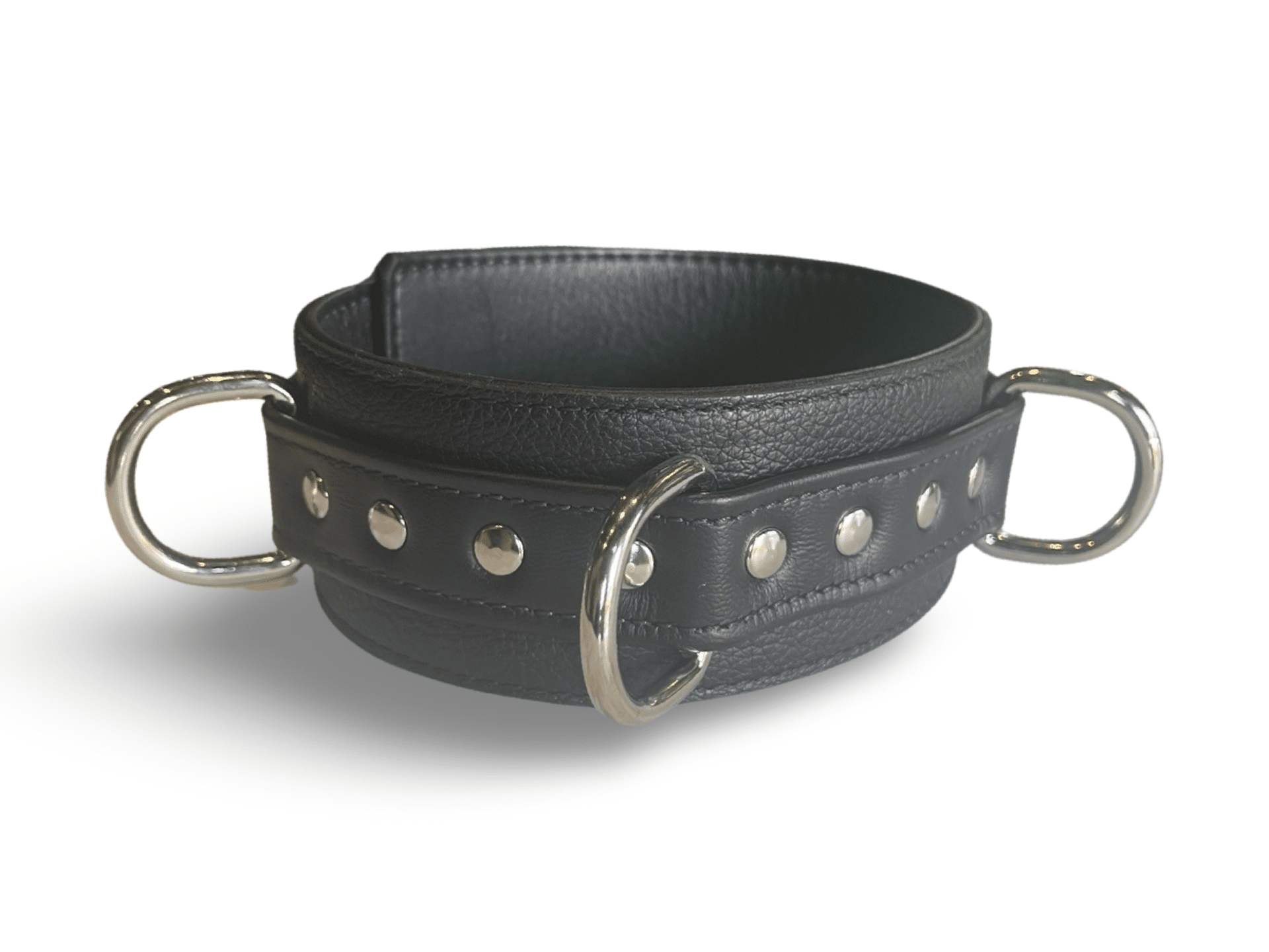 To complete the bondage set the 3 D Ring Bondage Collar adds a myriad of permutations to your Domination and submission play. The materials and construction are the same as the matching Wrist and Ankle Restraints. The outer layer of leather robust motor cycle weight and the inner layer of leather is made from fine lustrous garment leather. Smooth and soft against the skin. The outer adjustment strap is constructed from shoe ling leather offering the highest level of tensile strength. The rings just cry out for a dog lead. The two side rings are an ideal place to secure the scissor snaps from our matching wrist restraints rendering your partner open and available