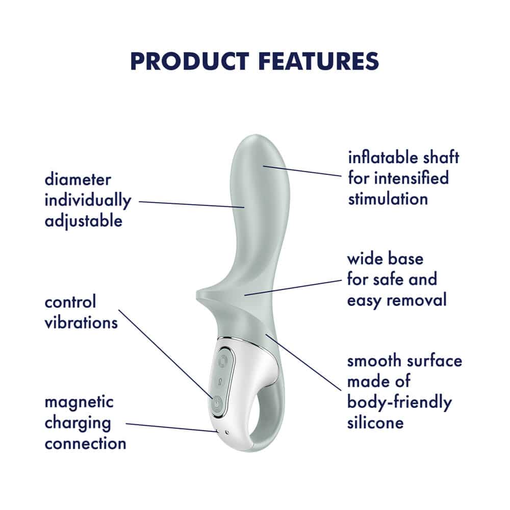 The Air Pump Booty 3 inflates in under 12 seconds and can be easily adjusted during the filling process. To fill, simply repeatedly push the fill button, to release, simply double click. Also control the 12 different vibration settings using the +/- buttons. The Air Pump Booty 3 is made of body-safe silicone and is rechargeable. Pump it up!