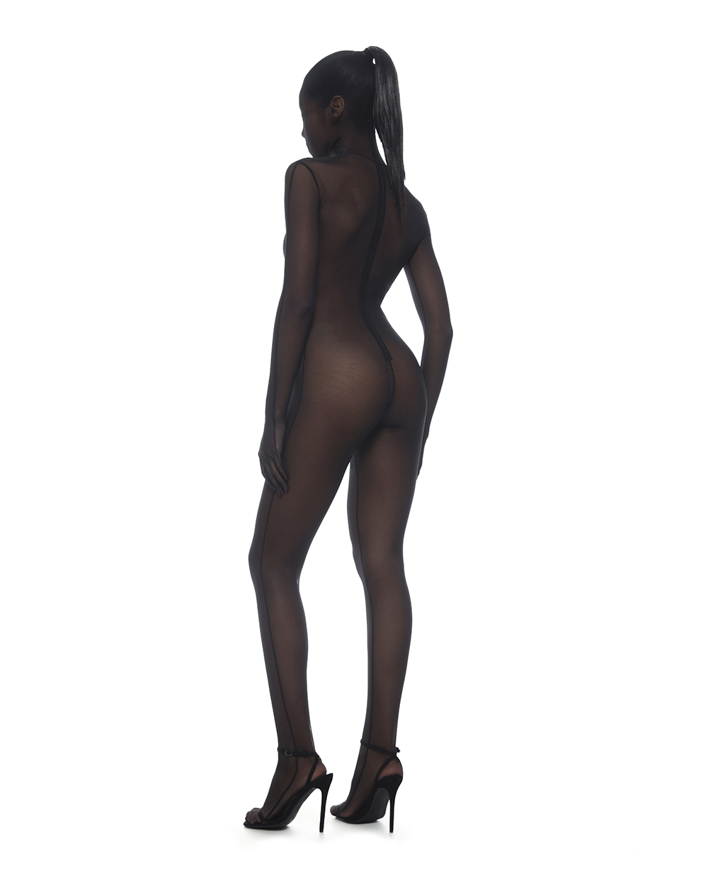This catsuit is made from practical mesh fabric. It fits perfectly to the body, giving the feeling of a second skin. This catsuit covers the body, arms, legs, face, and head completely. You can move freely and without discomfort in it. This bodysuit can be combined with erotic leather accessories, putting them on top of the bodysuit. On the head, there is a small cut for the hair. On the back is a zipper through which the catsuit is put on.