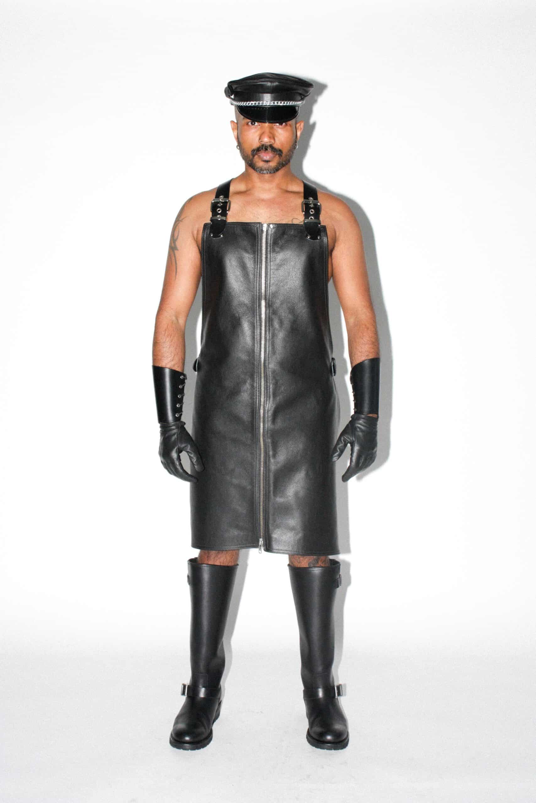 A commanding statement piece designed for both style and play. This apron is crafted from heavy-duty garment leather and finished with a chunky, full-length YKK zip that runs from neckline to hem for bold visual impact and easy access.