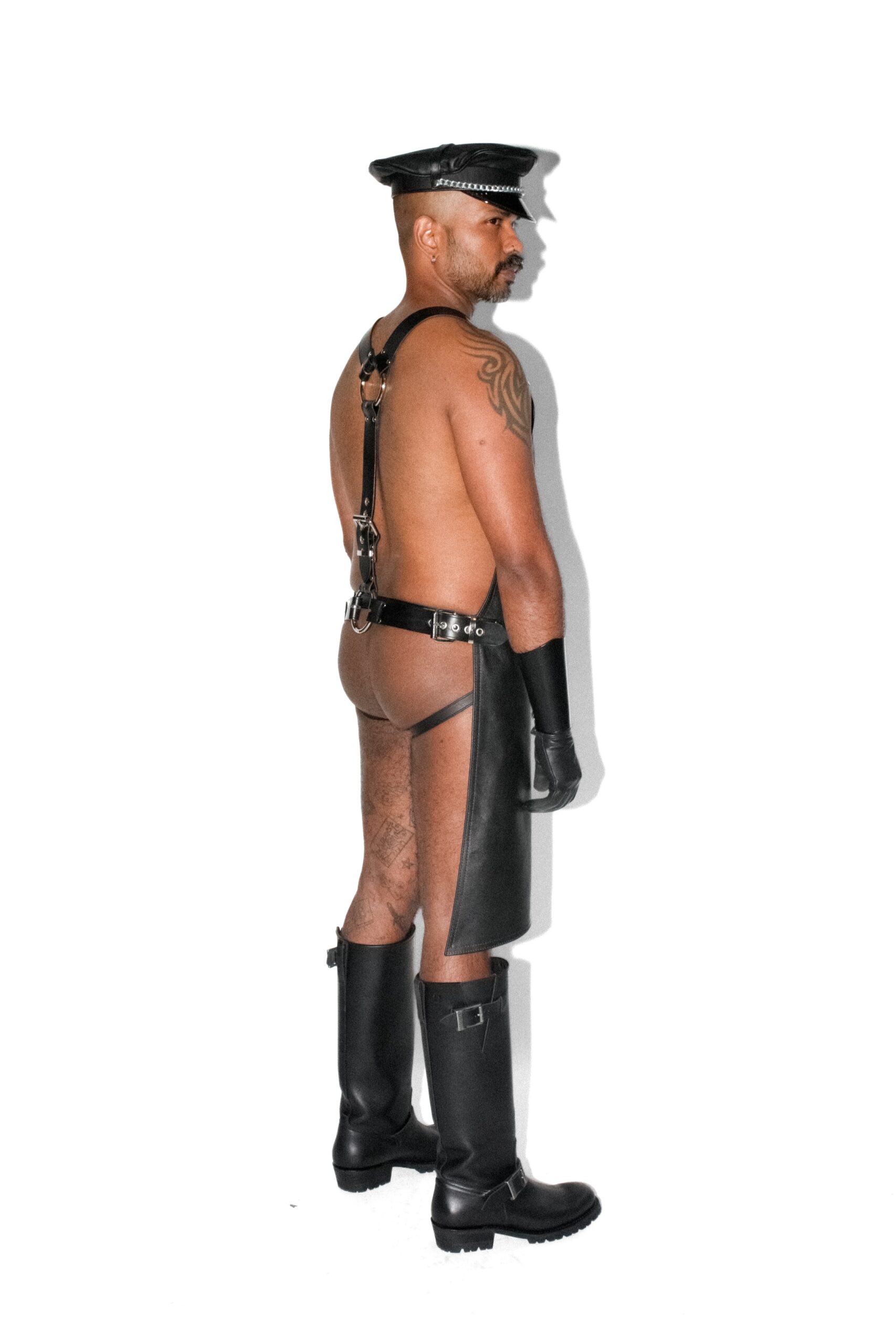 The apron is secured to the body with an adjustable Italian belt-leather harness back, allowing for a customised fit while creating strong, sculptural lines across the torso. Designed to sit comfortably at the waist and drape over the hips, it suits all body types.