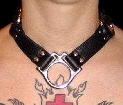 This fantastic looking collar that is created to fit into the contours of the neck. It has chrome fittings and is made with triple stitched garment leather which is comfortable and stylish. It has a buckles at the back and has good adjustment and comes in two sizes to fit most necks! This collar is popular with many of our customers for public wear as it doesn’t automatically scream SLAVE.