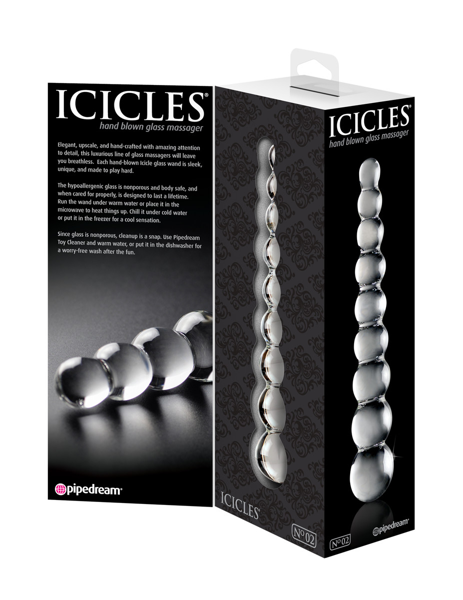 Elegant, upscale, and hand-crafted with amazing attention to detail, this luxurious line of glass massagers will leave you breathless. Each hand-blown Icicle glass wand is sleek, unique, and made to play hard. The hypoallergenic glass is nonporous and body safe, and when cared for properly, is designed to last a lifetime. Run the wand under warm water or place it in the microwave to heat things up. Chill it under cold water or put it in the freezer for a cool sensation. Since glass is nonporous, clean-up is a snap. Use Pipedream Toy Cleaner and warm water, or throw it in the dishwasher for a worry-free wash after the fun.