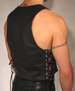These vests are made with our finest leather with lace up sides and a full back. The front is made to sit open. A willing addition to every leather man’s kit!