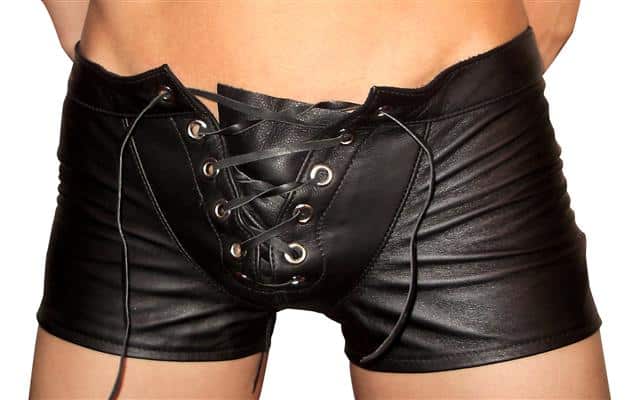 Made from our finest leather these shorts feature an eyelet lace up front with a built in cod for ample men’s business.