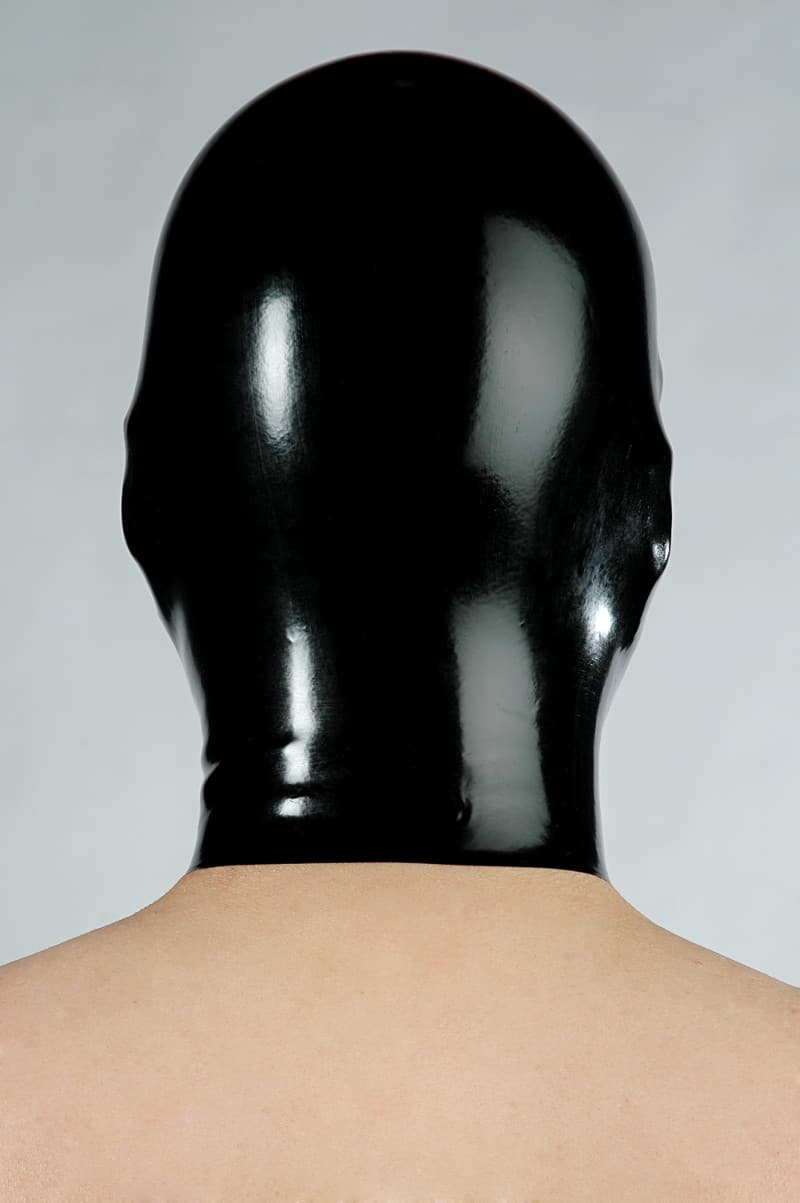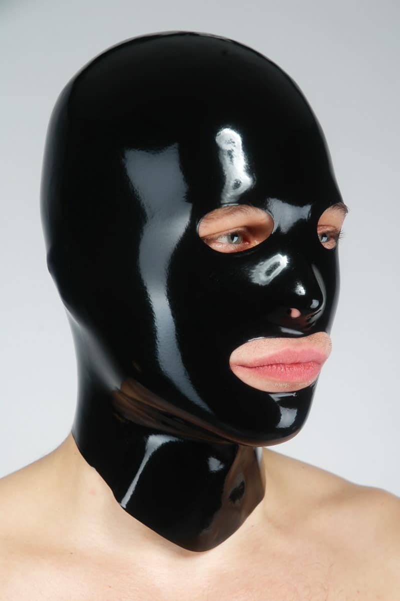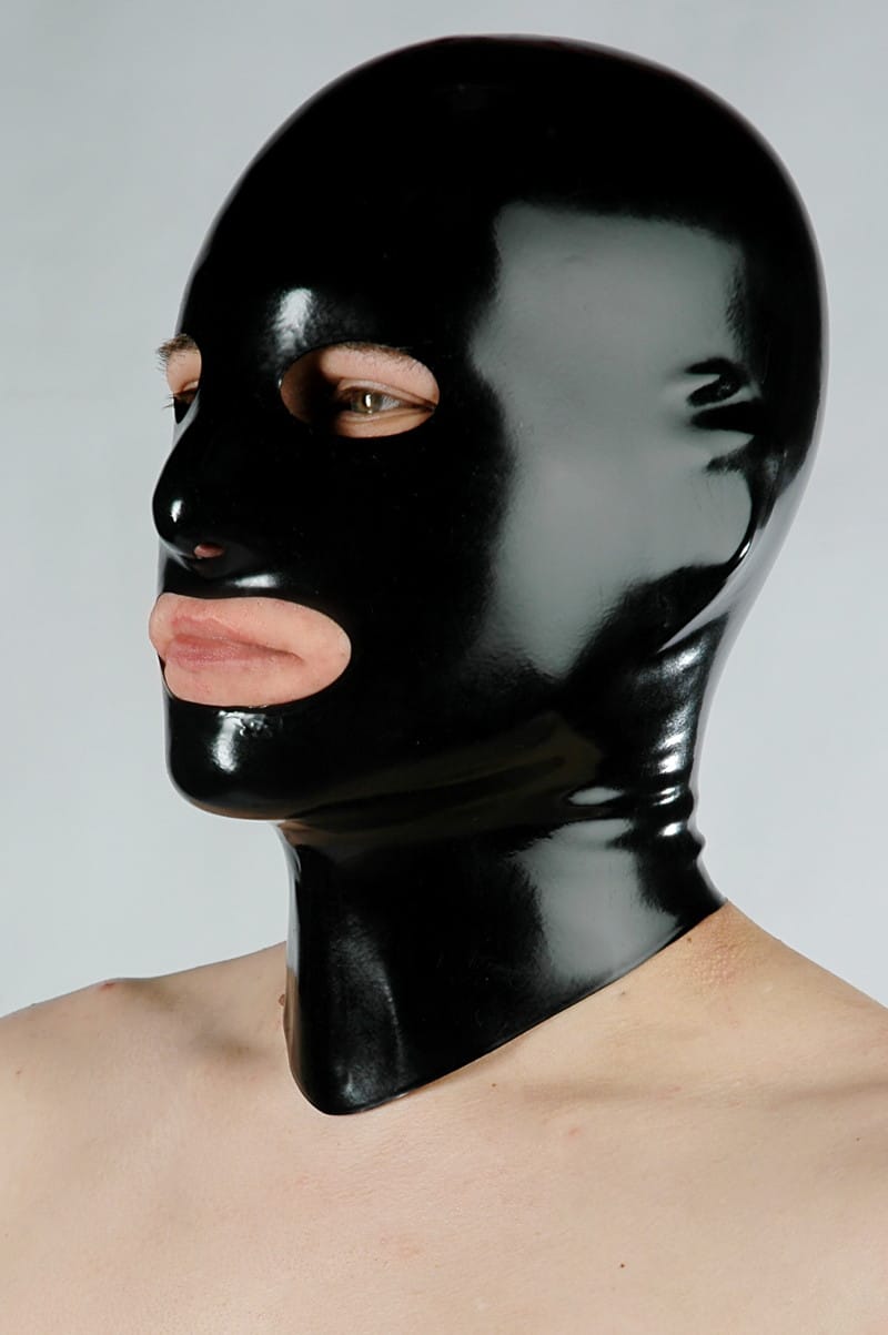 This anatomically molded latex hood hugs your head seamlessly. It has a large mouth opening, two eye openings and 2 nostrils. The material thickness is approx. 0.4 mm.