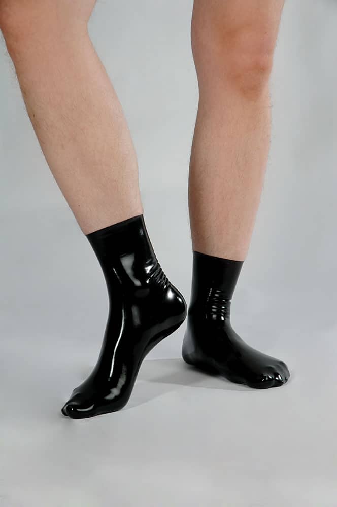 Anatomical moulded latex socks (material thickness about 0.4 mm). They have a real right and a real left foot, and they fit absolutely fantastic.Anatomical moulded latex socks (material thickness about 0.4 mm). They have a real right and a real left foot, and they fit absolutely fantastic.
