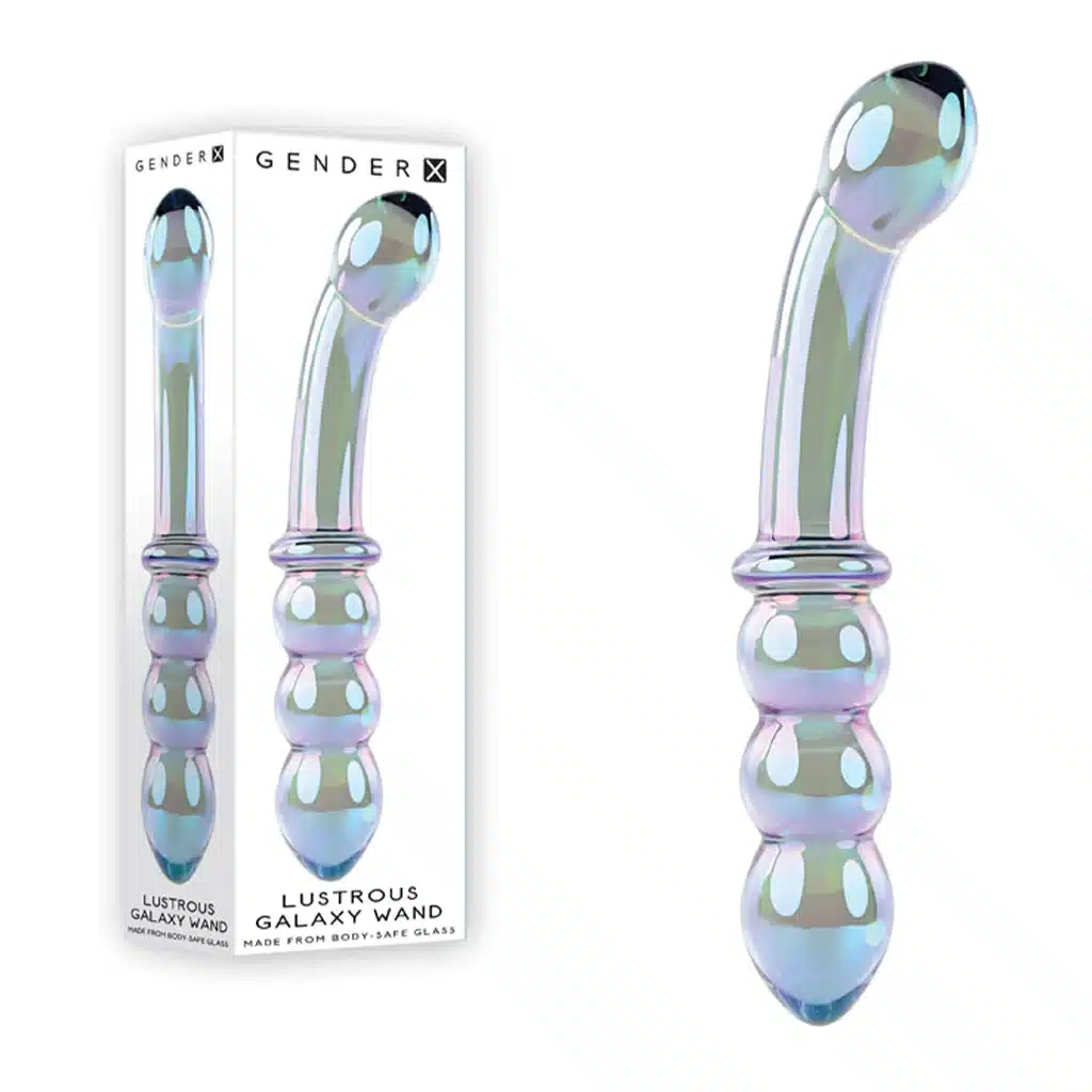 Nonporous and extremely hygienic, the surface of this iridescent blue-green-violet beauty is deliciously slippery and smooth, especially with your favourite lubricant. Try the gently curved end with its generous bulbous head or enjoy the triple-beaded end with its targeted, tapered tip. A ring between the two shafts keeps your grip grounded so you can focus on the ultimate pleasure that only glass can deliver!