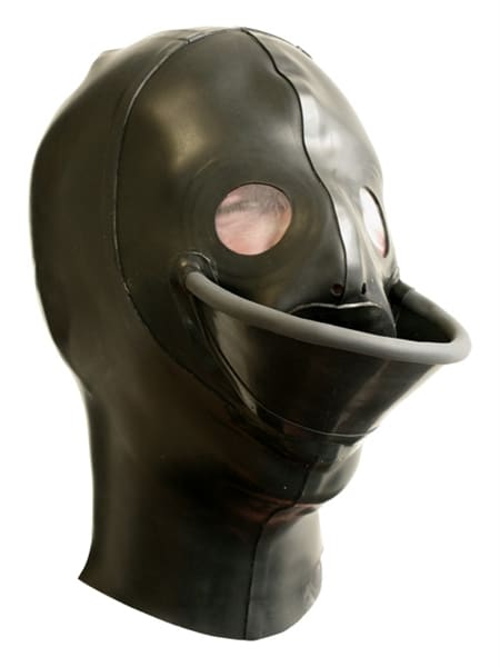 The cup is latex covered enforced material which keeps it shape well regardless of the content of the cup or the tilt of the head.Inside the cup is a rubberized thick tube so your mouth is forced wide open to enjoy the liquid flow. The inner diameter of the tube (32 mm / 1 1/4 inch) is chosen carefully so you’re still able to put it in your thirsty mouth, and your mate can shove his dick in after the dive (if his cock isn’t too thickly built). We don’t think that lubrication is required in this case, since it will be all nice ‘n wet down there… The noseholes ensure that you can still breathe when the mouthgag is fully stuffed.We purposely built in plastic eyes so you can look straight into the yellow stream when it is cumming, before it lands in the cup, down your face and in your throat…Oh,we forgot: should this hood be a bit too scary for you because you’re afraid that you might drown: Nooooo, don’t be: when you just bend your head forward the liquid will run out of the urinal cap to the ground. Forces of gravity you know.