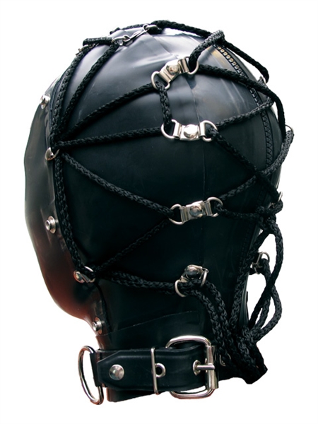 This bondage hood by Mr B features tie points, which allows the hood to be laced up tight over the zip.