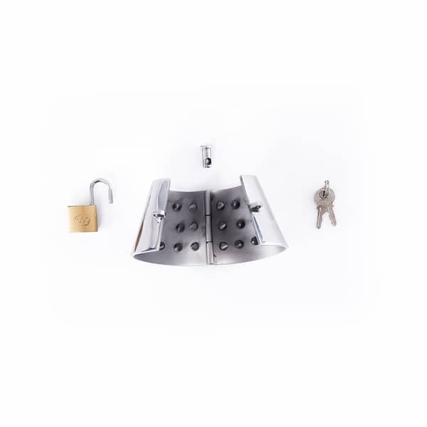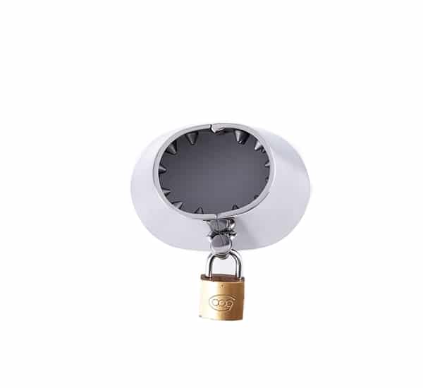 The Oval Spike Ball Stretcher has a parachute style shape to fit nicely around your ball sack, no matter how big or small your balls are. The spikes on the inside will poke, but they also have slightly rounded tips so they will not pierce the skin. Opening with a hinge, it is easy to put on and take off this device. This item weighs about 9 oz, so it is sure to tug your balls south. The stretcher comes with a padlock and key, so whoever the keyholder is can secure it shut, putting them in control. This toy is suitable for beginners and professionals.