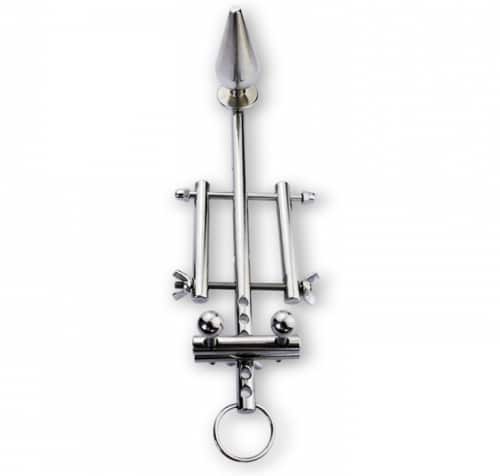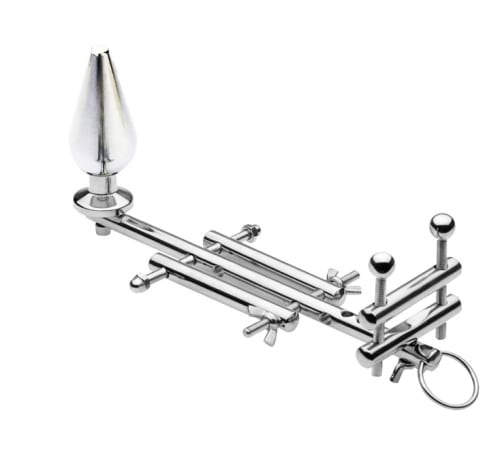 This exquisitely crafted piece is the ultimate constriction device. Constructed entirely from high grade stainless steel, each bar and rod is designed to envelop and restrict your male sub, keeping them deliciously confined. The top piece is designed to put pressure at the base of the cock, with two adjustable screws to either side. The middle piece is designed to separate and confine the testicles, one to each side of the bar. Two wing nuts allow you to trap them between the rods, for an inescapable prison of steel. The anal plug is fixed onto the end of the supporting bar, and is removable.