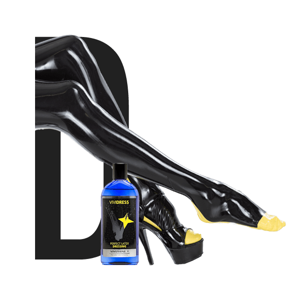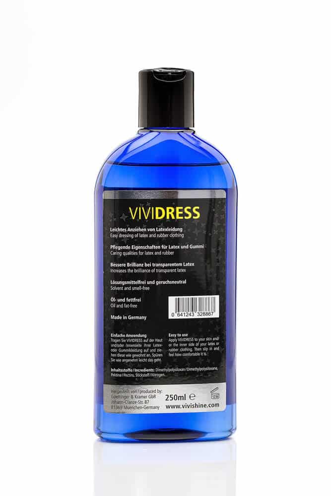 VIVIDRESSÂ is therefore particularly fluid and allows the latex to glide playfully over the skin when donned. By pressing lightly on the oval bottle, it can be easily dosed and applied directly to the inside the latex or skin. It wets the skin under the latex and thus also ensures that the clothing does not stick to the skin but can glide. This prevents partial stresses or excessive stretching and thus prevents cracks. Also, the latex can be easily stripped off even after many hours without tearing.