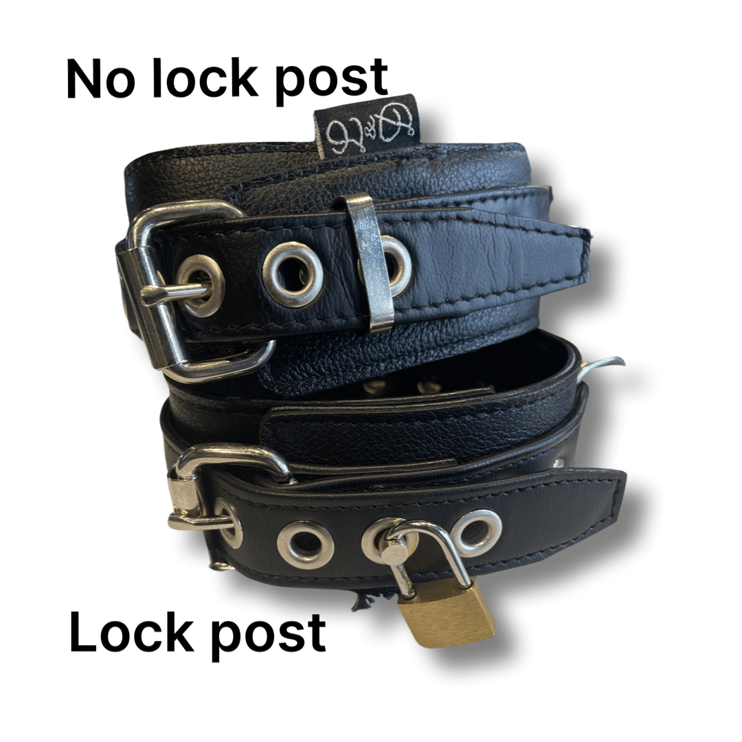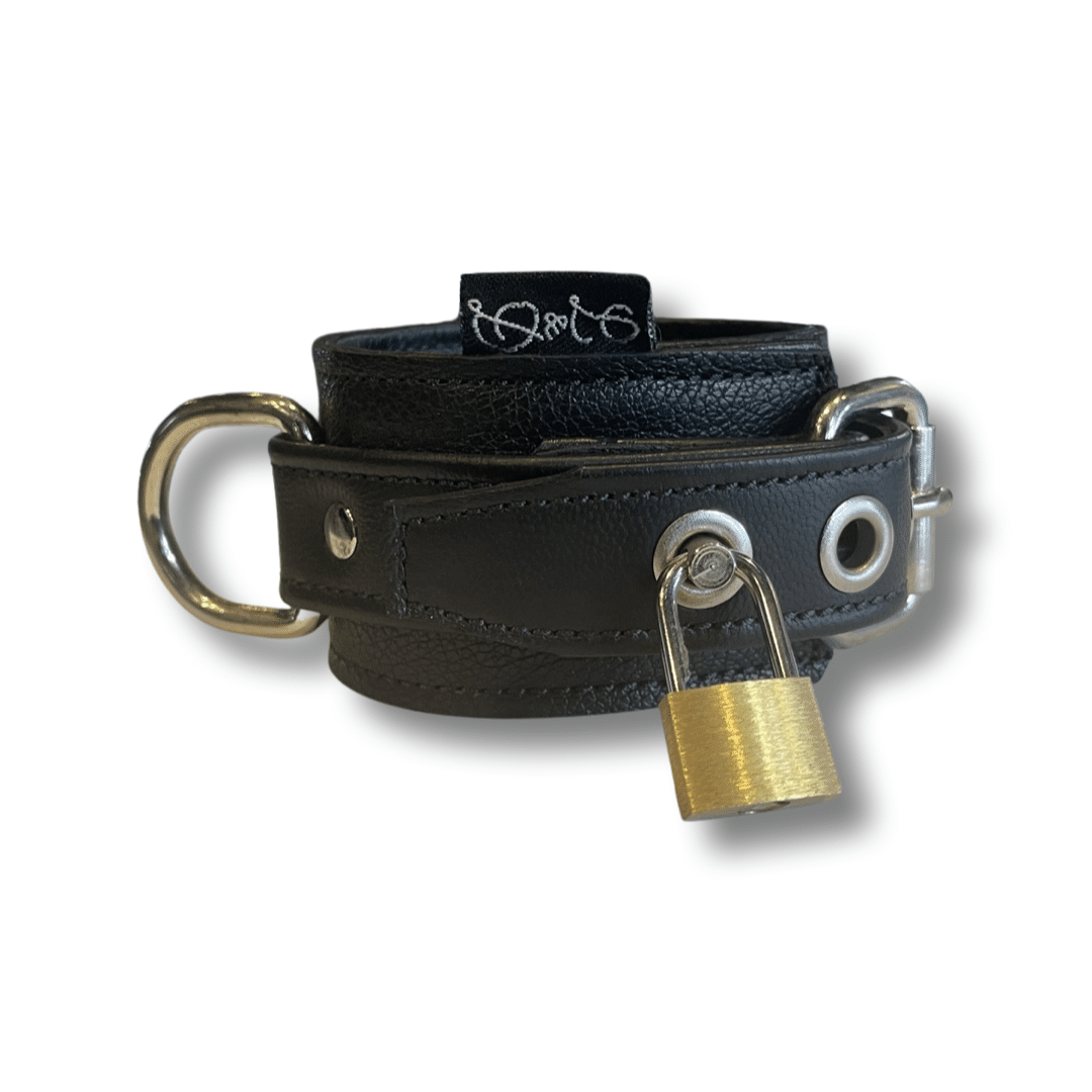 This is a sturdy yet very comfortable restraint. The outer layer of leather is a robust motor cycle weight with that beautiful traditional peddled grain. The inner layer of leather is made from two layers of fine garment leather with that lustrous nappa touch against the skin. This is the same leather we make all of our intimate leather garments. The outer securing strap is constructed from shoe ling leather offering the highest level of tensile strength. Even with rough play this won’t stretch out of shape. There is sufficient adjustment to not only fit most people but this set can double as ankle restraints in most cases.