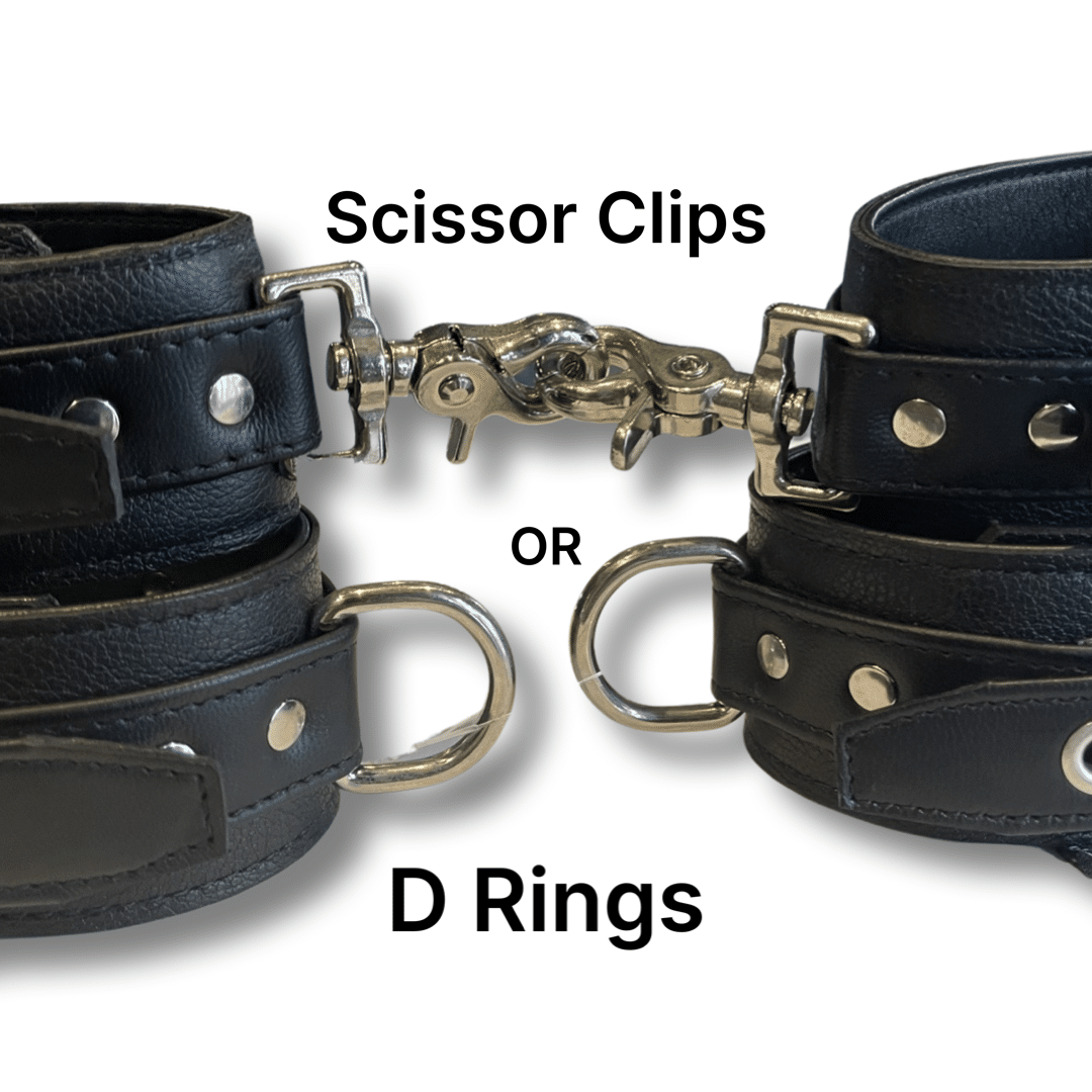 This is a sturdy yet very comfortable restraint. The outer layer of leather is a robust motor cycle weight with that beautiful traditional peddled grain. The inner layer of leather is made from two layers of fine garment leather with that lustrous nappa touch against the skin. This is the same leather we make all of our intimate leather garments. The outer securing strap is constructed from shoe ling leather offering the highest level of tensile strength. Even with rough play this won’t stretch out of shape. The convenience of the scissor snap is ideal to be used with rope, to secure the wrists to each other or to clamp to a solid object. There is sufficient adjustment to not only fit most people but this set can double as ankle restraints in most cases.